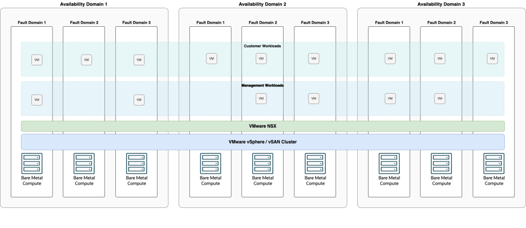 The multiavailability domain deployment is only available in OCI public cloud regions with at least three availability domains. For multiavailability domain deployment, you must reserve at least 33% failover resources to be able to withstand the loss of an availability domain. The same applies to the vSAN configuration if the solution use three nodes, which is the minimum that the vSAN policy must be according to RAID-1 with FTT-1.